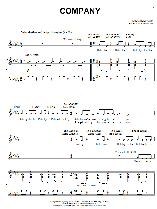 Download or print Stephen Sondheim Company sheet music, chords and digital score arranged for Piano, Vocal & Guitar Chords (Right-Hand Melody). This Musical/Show score includes 12 page(s).