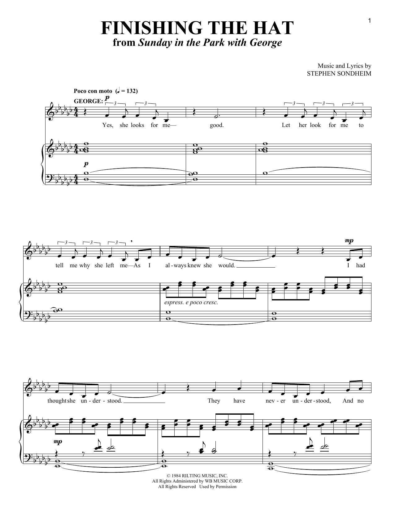 Download or print Stephen Sondheim Finishing The Hat sheet music, chords and digital score arranged for Piano & Vocal. This Musical/Show score includes 8 page(s).