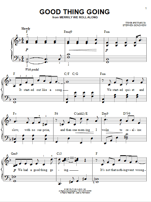 Download or print Stephen Sondheim Good Thing Going sheet music, chords and digital score arranged for Piano & Vocal. This Broadway score includes 4 page(s).