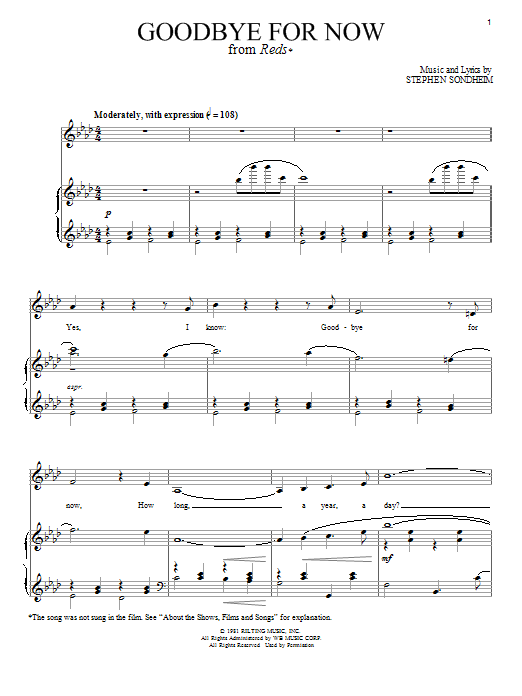 Download or print Stephen Sondheim Goodbye For Now sheet music, chords and digital score arranged for Piano & Vocal. This Broadway score includes 4 page(s).