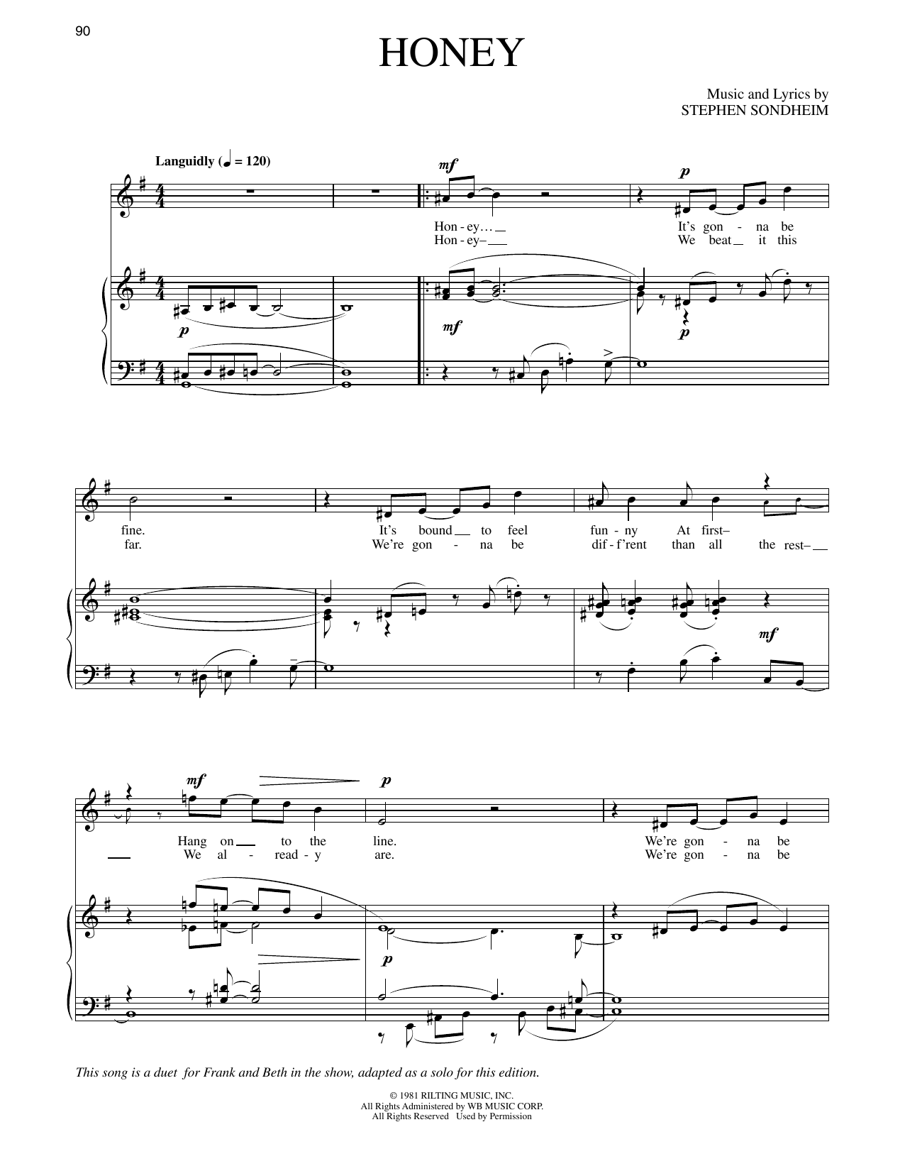 Download or print Stephen Sondheim Honey (from Merrily We Roll Along) sheet music, chords and digital score arranged for Piano & Vocal. This Broadway score includes 3 page(s).