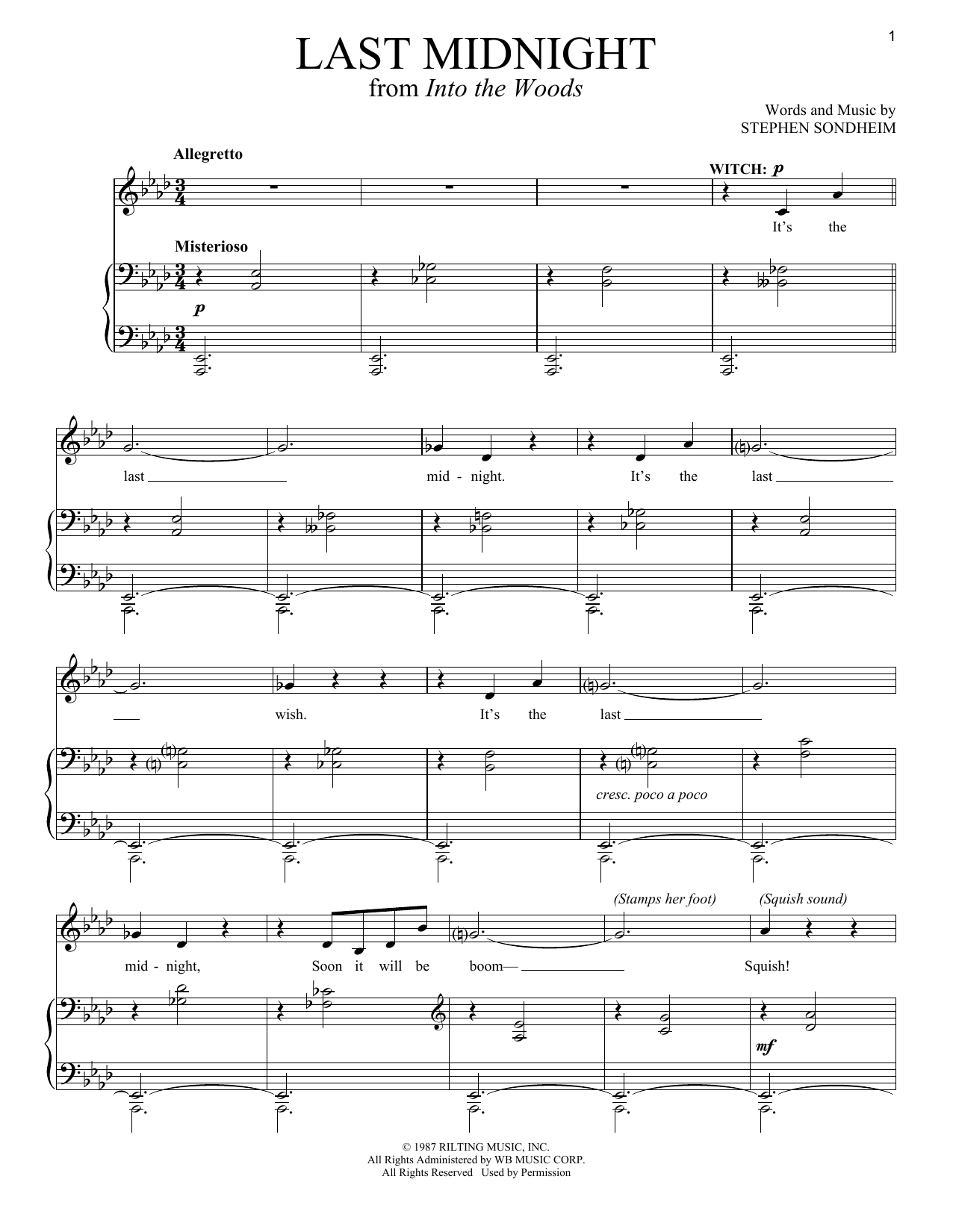 Download or print Stephen Sondheim Last Midnight (from Into The Woods) sheet music, chords and digital score arranged for Piano & Vocal. This Disney score includes 11 page(s).