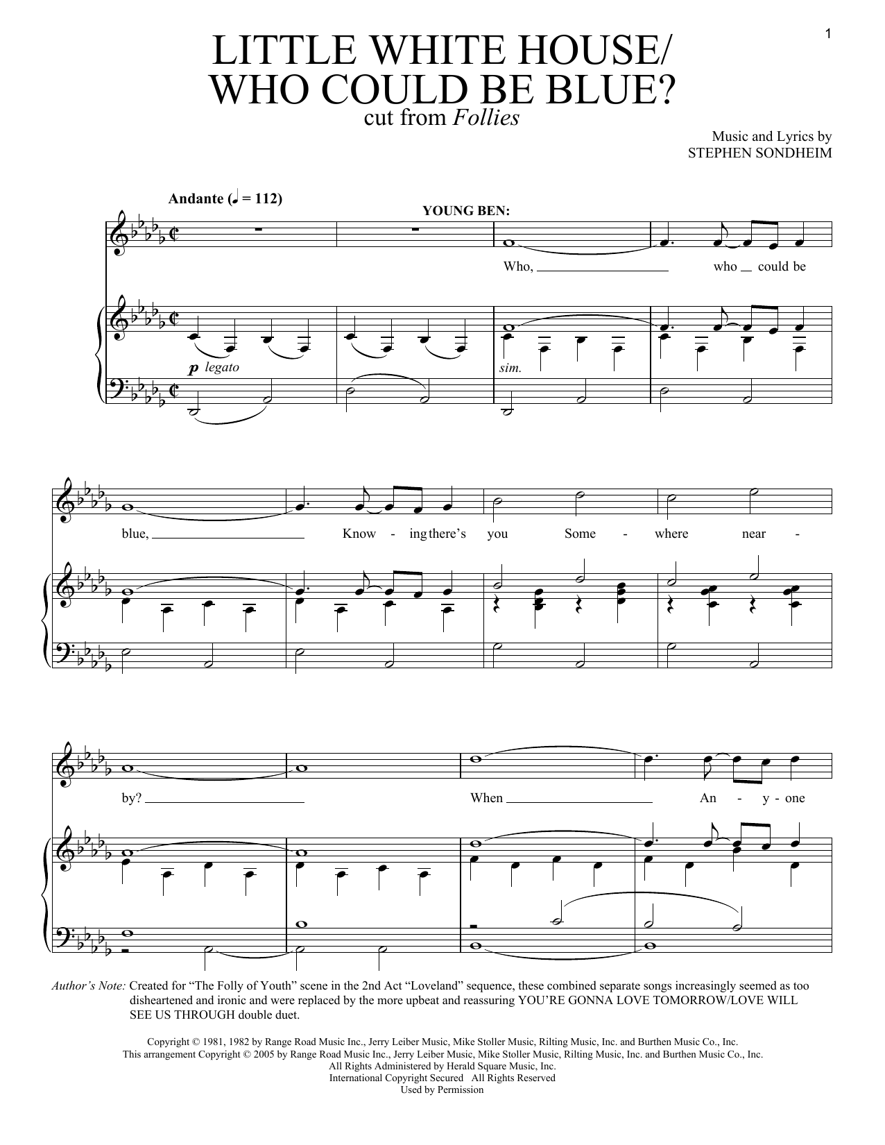 Download or print Stephen Sondheim Little White House/Who Could Be Blue? sheet music, chords and digital score arranged for Vocal Duet. This Musical/Show score includes 6 page(s).