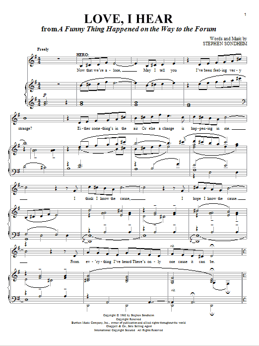 Download or print Stephen Sondheim Love, I Hear sheet music, chords and digital score arranged for Piano & Vocal. This Musical/Show score includes 5 page(s).