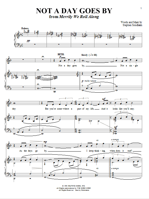 Download or print Stephen Sondheim Not A Day Goes By sheet music, chords and digital score arranged for Piano & Vocal. This Broadway score includes 4 page(s).