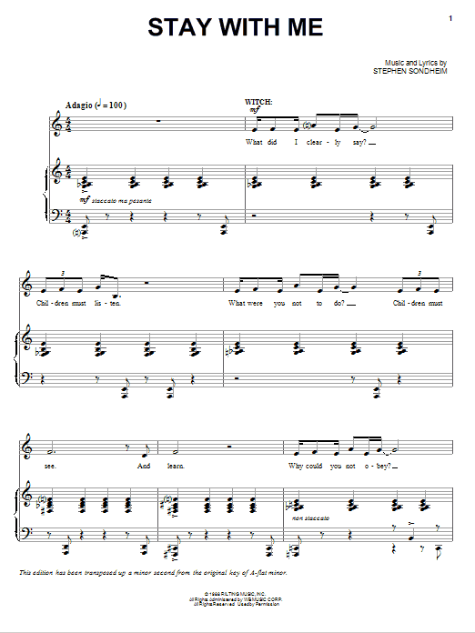 Download or print Stephen Sondheim Stay With Me (from Into The Woods) sheet music, chords and digital score arranged for Piano & Vocal. This Broadway score includes 5 page(s).