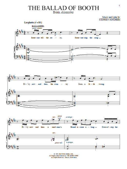 Download or print Stephen Sondheim The Ballad Of Booth (Part I) sheet music, chords and digital score arranged for Piano & Vocal. This Broadway score includes 18 page(s).