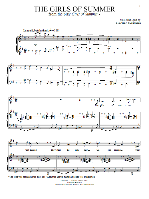 Download or print Stephen Sondheim The Girls Of Summer sheet music, chords and digital score arranged for Piano & Vocal. This Musical/Show score includes 6 page(s).