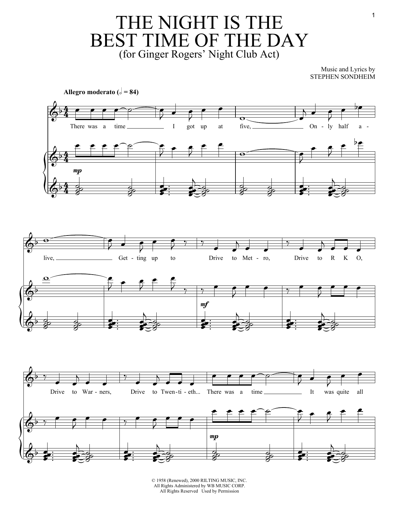 Download or print Stephen Sondheim The Night Is The Best Time Of The Day sheet music, chords and digital score arranged for Piano & Vocal. This Broadway score includes 7 page(s).