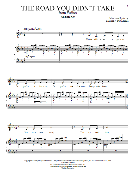 Download or print Stephen Sondheim The Road You Didn't Take sheet music, chords and digital score arranged for Piano & Vocal. This Musical/Show score includes 9 page(s).