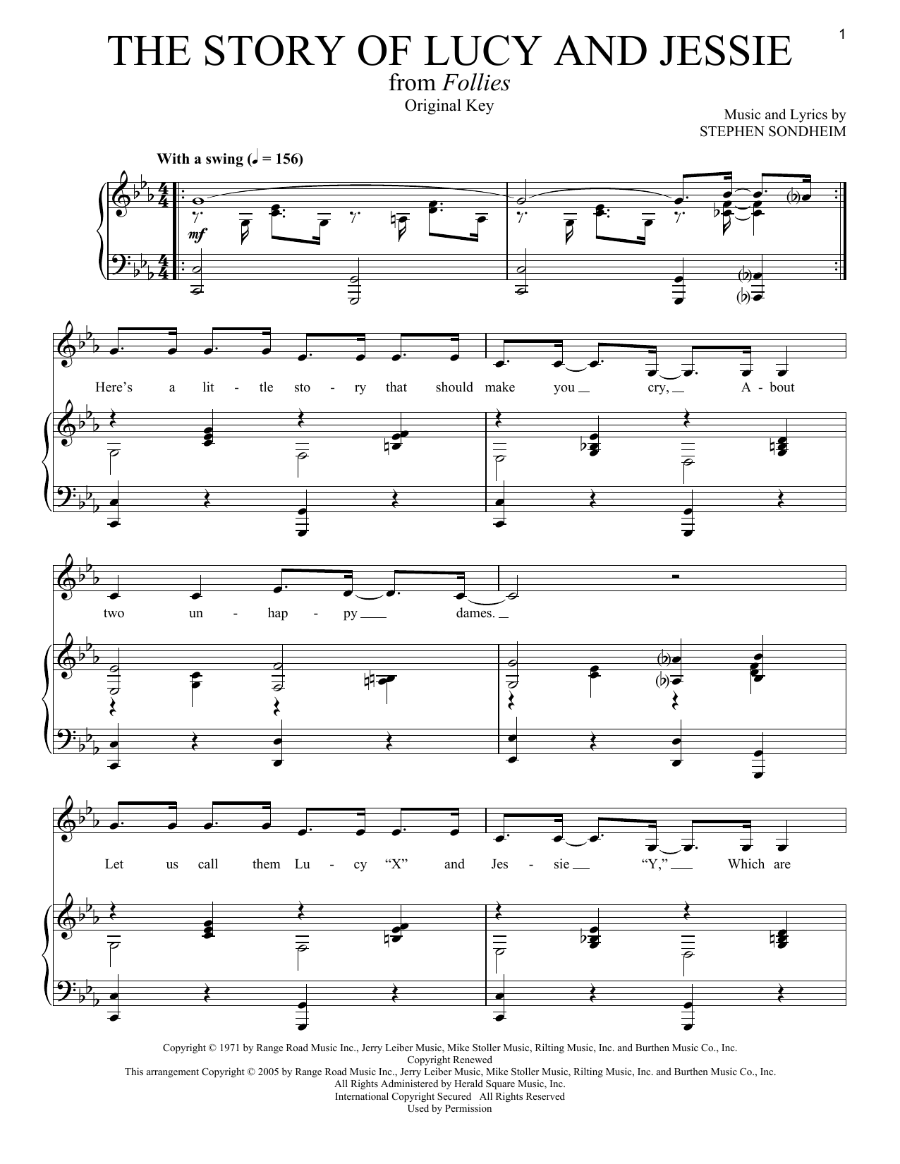 Download or print Stephen Sondheim The Story Of Lucy And Jessie sheet music, chords and digital score arranged for Piano & Vocal. This Musical/Show score includes 8 page(s).
