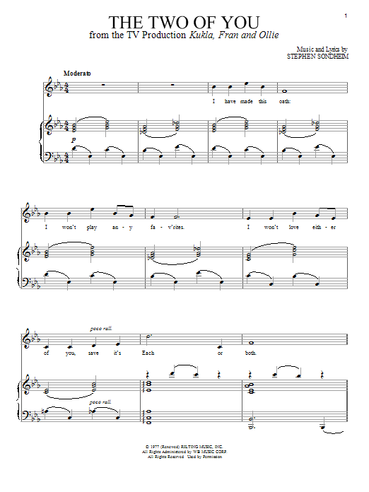 Download or print Stephen Sondheim The Two Of You sheet music, chords and digital score arranged for Piano & Vocal. This Musical/Show score includes 4 page(s).