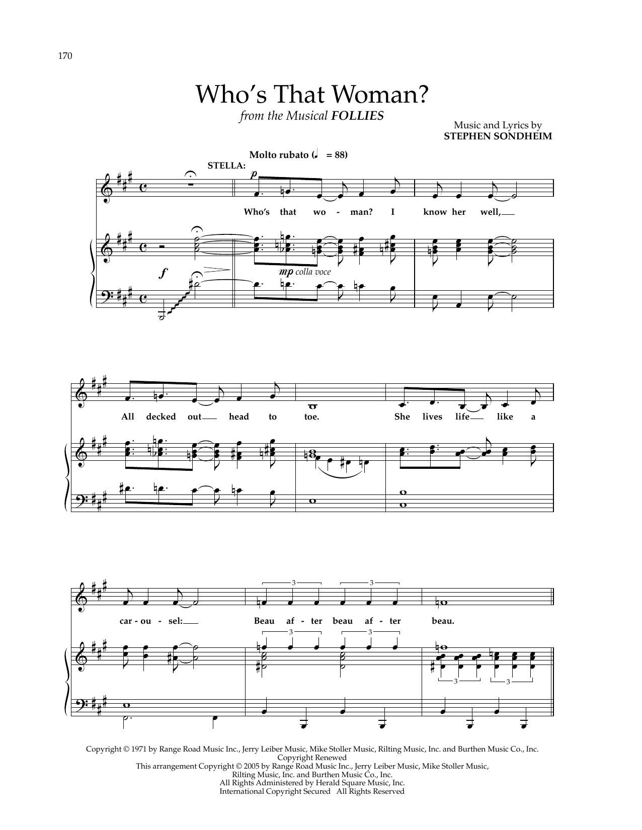 Download or print Stephen Sondheim Who's That Woman? (from Follies) sheet music, chords and digital score arranged for Piano & Vocal. This Broadway score includes 10 page(s).