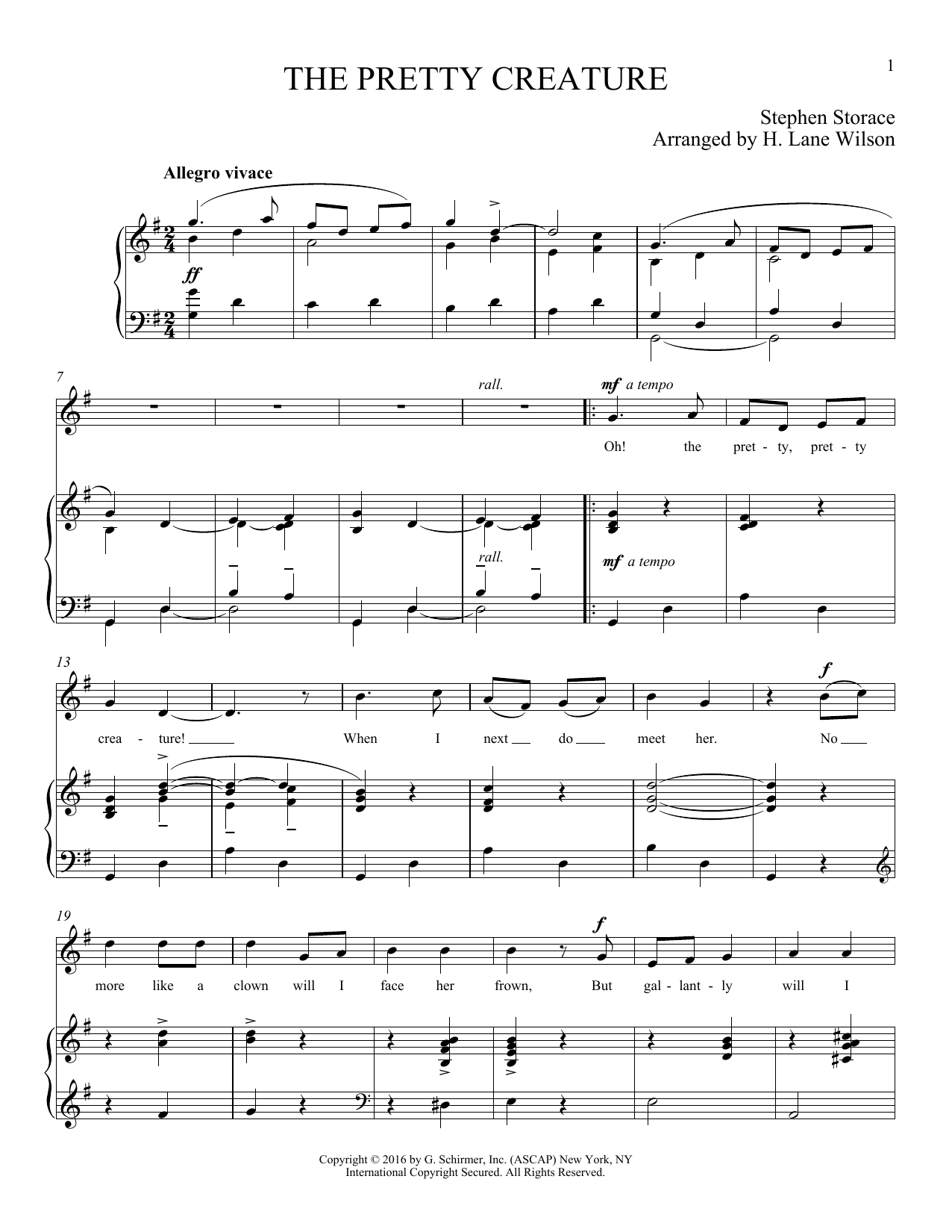 Download or print Stephen Storace The Pretty Creature sheet music, chords and digital score arranged for Piano & Vocal. This Classical score includes 5 page(s).