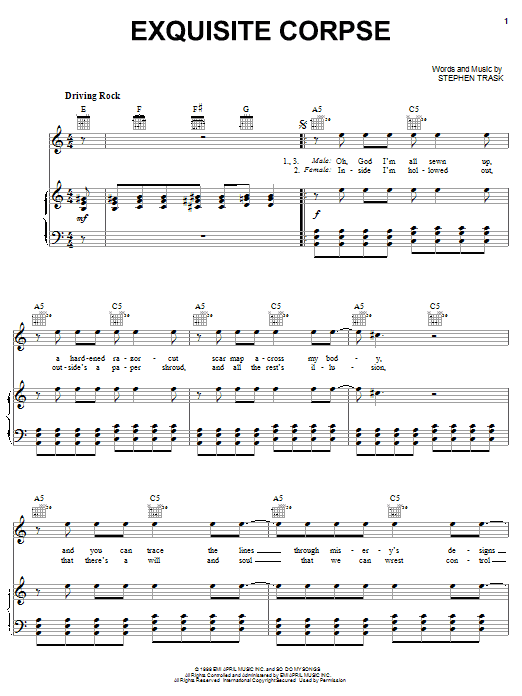 Download or print Stephen Trask Exquisite Corpse sheet music, chords and digital score arranged for Piano, Vocal & Guitar Chords (Right-Hand Melody). This Musical/Show score includes 5 page(s).