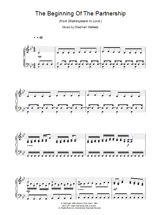 Download or print Stephen Warbeck The Beginning Of The Partnership (from Shakespeare In Love) sheet music, chords and digital score arranged for Piano Solo. This Film/TV score includes 4 page(s).