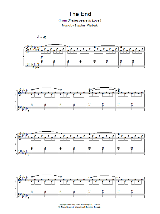 Download or print Stephen Warbeck The End (from Shakespeare In Love) sheet music, chords and digital score arranged for Piano Solo. This Film/TV score includes 7 page(s).
