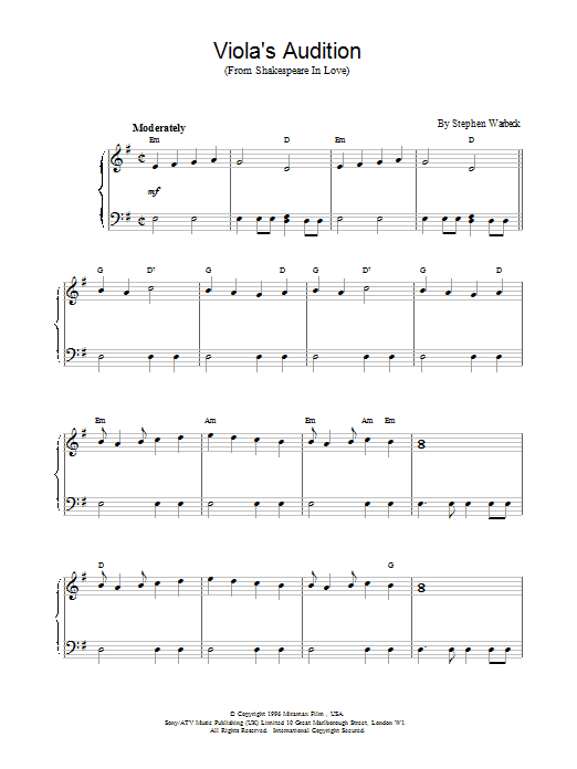 Download or print Stephen Warbeck Viola's Audition sheet music, chords and digital score arranged for Piano Solo. This Film/TV score includes 3 page(s).