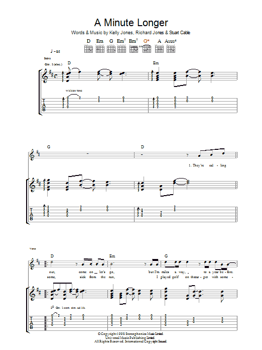 Download or print Stereophonics A Minute Longer sheet music, chords and digital score arranged for Guitar Chords/Lyrics. This Rock score includes 2 page(s).