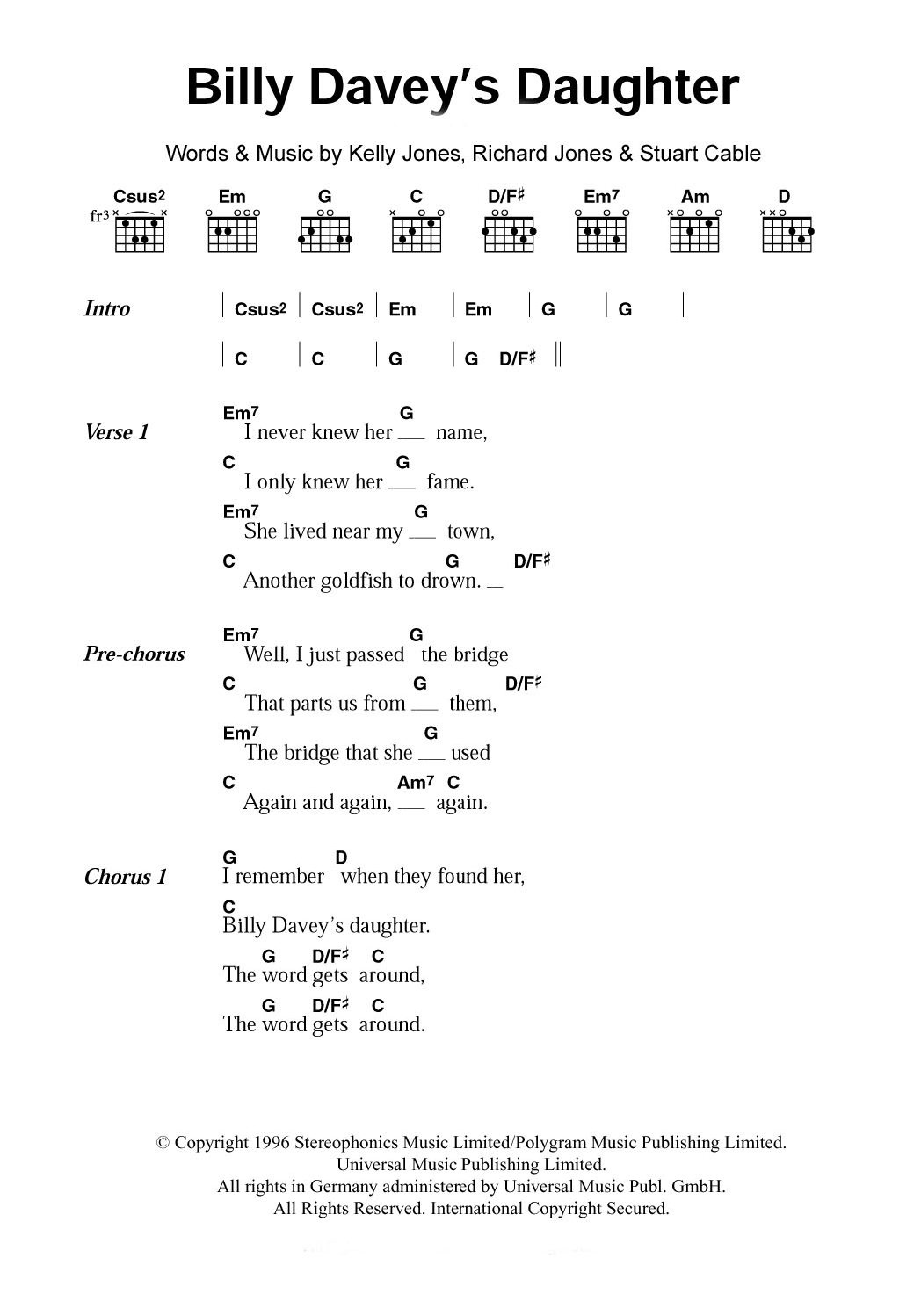 Download or print Stereophonics Billy Davey's Daughter sheet music, chords and digital score arranged for Guitar Chords/Lyrics. This Rock score includes 2 page(s).