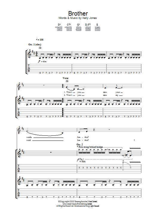 Download or print Stereophonics Brother sheet music, chords and digital score arranged for Guitar Tab. This Rock score includes 8 page(s).