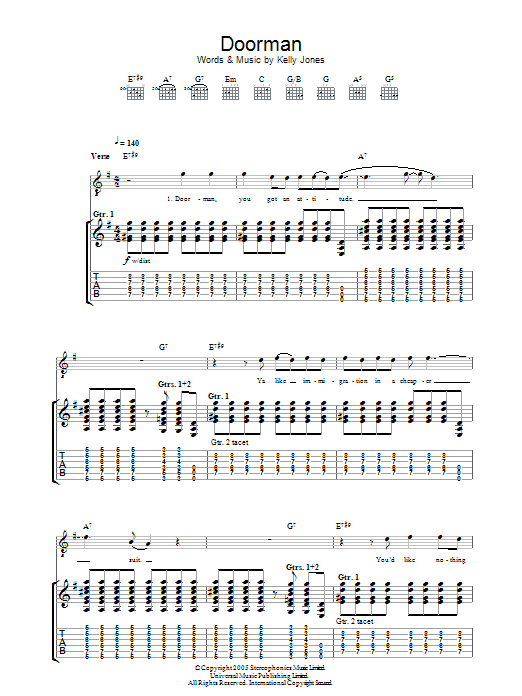 Download or print Stereophonics Doorman sheet music, chords and digital score arranged for Guitar Tab. This Rock score includes 9 page(s).