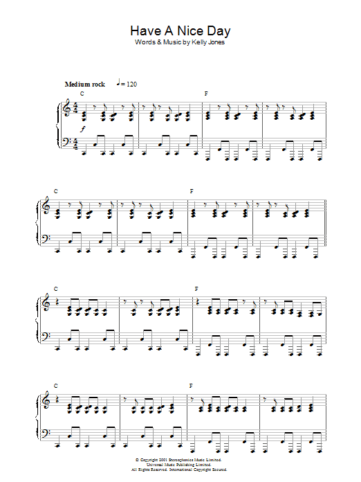 Download or print Stereophonics Have A Nice Day sheet music, chords and digital score arranged for Piano Solo. This Pop score includes 4 page(s).