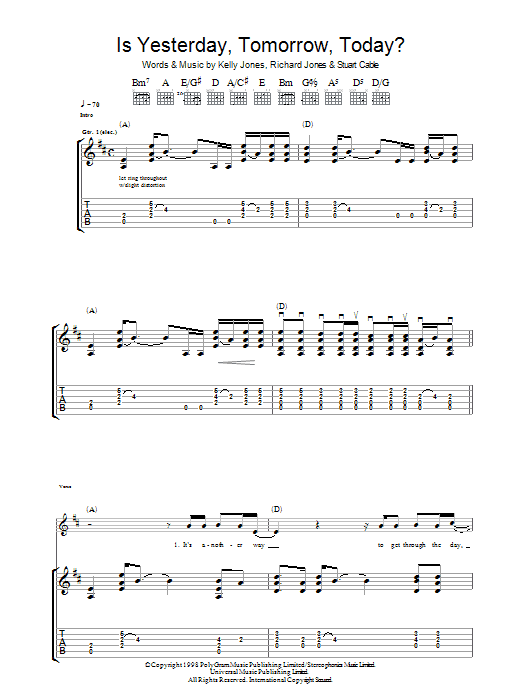 Download or print Stereophonics Is Yesterday, Tomorrow, Today? sheet music, chords and digital score arranged for Guitar Chords/Lyrics. This Rock score includes 2 page(s).