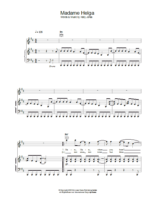Download or print Stereophonics Madame Helga sheet music, chords and digital score arranged for Guitar Chords/Lyrics. This Rock score includes 3 page(s).