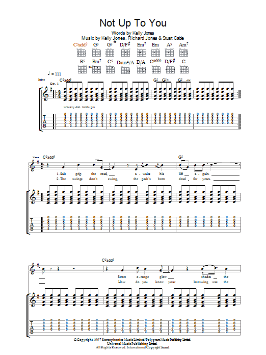 Download or print Stereophonics Not Up To You sheet music, chords and digital score arranged for Guitar Tab. This Rock score includes 9 page(s).