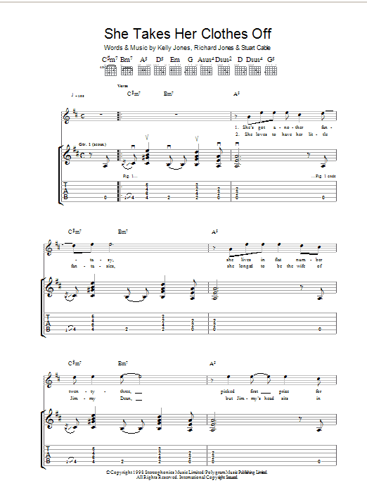 Download or print Stereophonics She Takes Her Clothes Off sheet music, chords and digital score arranged for Guitar Tab. This Rock score includes 9 page(s).