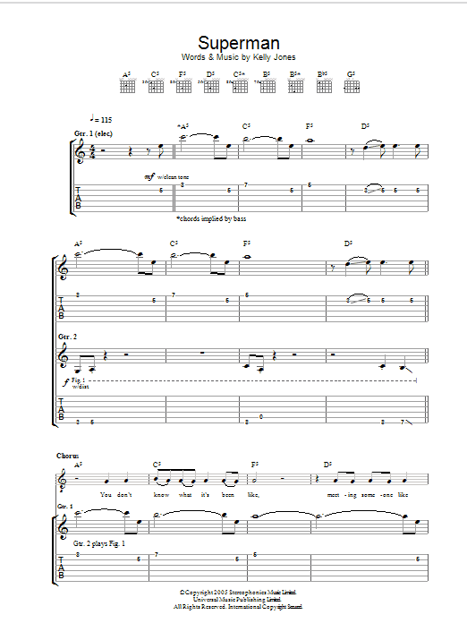 Download or print Stereophonics Superman sheet music, chords and digital score arranged for Guitar Tab. This Rock score includes 8 page(s).