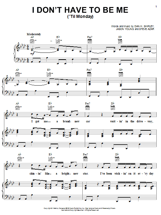 Download or print Steve Azar I Don't Have To Be Me ('Til Monday) sheet music, chords and digital score arranged for Piano, Vocal & Guitar Chords (Right-Hand Melody). This Pop score includes 6 page(s).