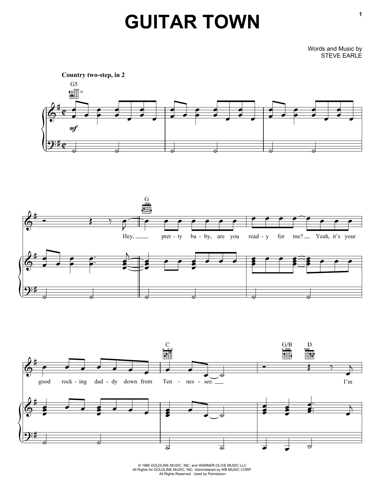 Download or print Steve Earle Guitar Town sheet music, chords and digital score arranged for Solo Guitar. This Country score includes 2 page(s).