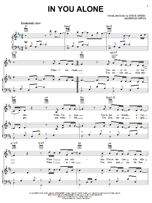 Download or print Steve Green In You Alone sheet music, chords and digital score arranged for Piano, Vocal & Guitar Chords (Right-Hand Melody). This Christian score includes 4 page(s).