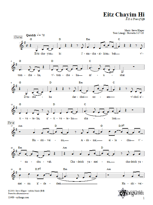 Download or print Steve Klaper Eitz Chayim Hi sheet music, chords and digital score arranged for Lead Sheet / Fake Book. This Traditional score includes 2 page(s).