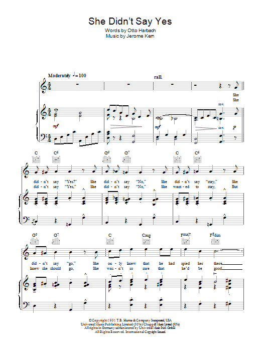 Download or print Steve Lawrence She Didn't Say Yes sheet music, chords and digital score arranged for Piano, Vocal & Guitar Chords. This Musical/Show score includes 5 page(s).