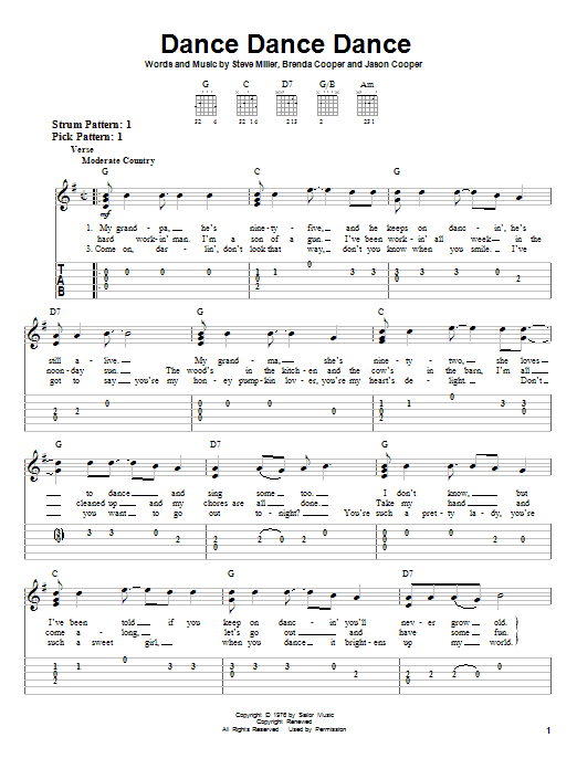 Download or print Steve Miller Band Dance Dance Dance sheet music, chords and digital score arranged for Guitar Tab. This Pop score includes 6 page(s).