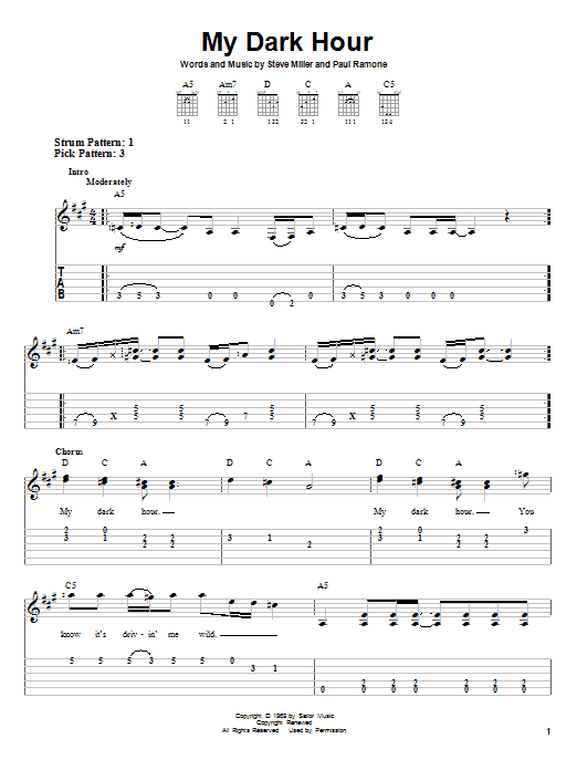 Download or print Steve Miller Band My Dark Hour sheet music, chords and digital score arranged for Guitar Tab. This Pop score includes 9 page(s).