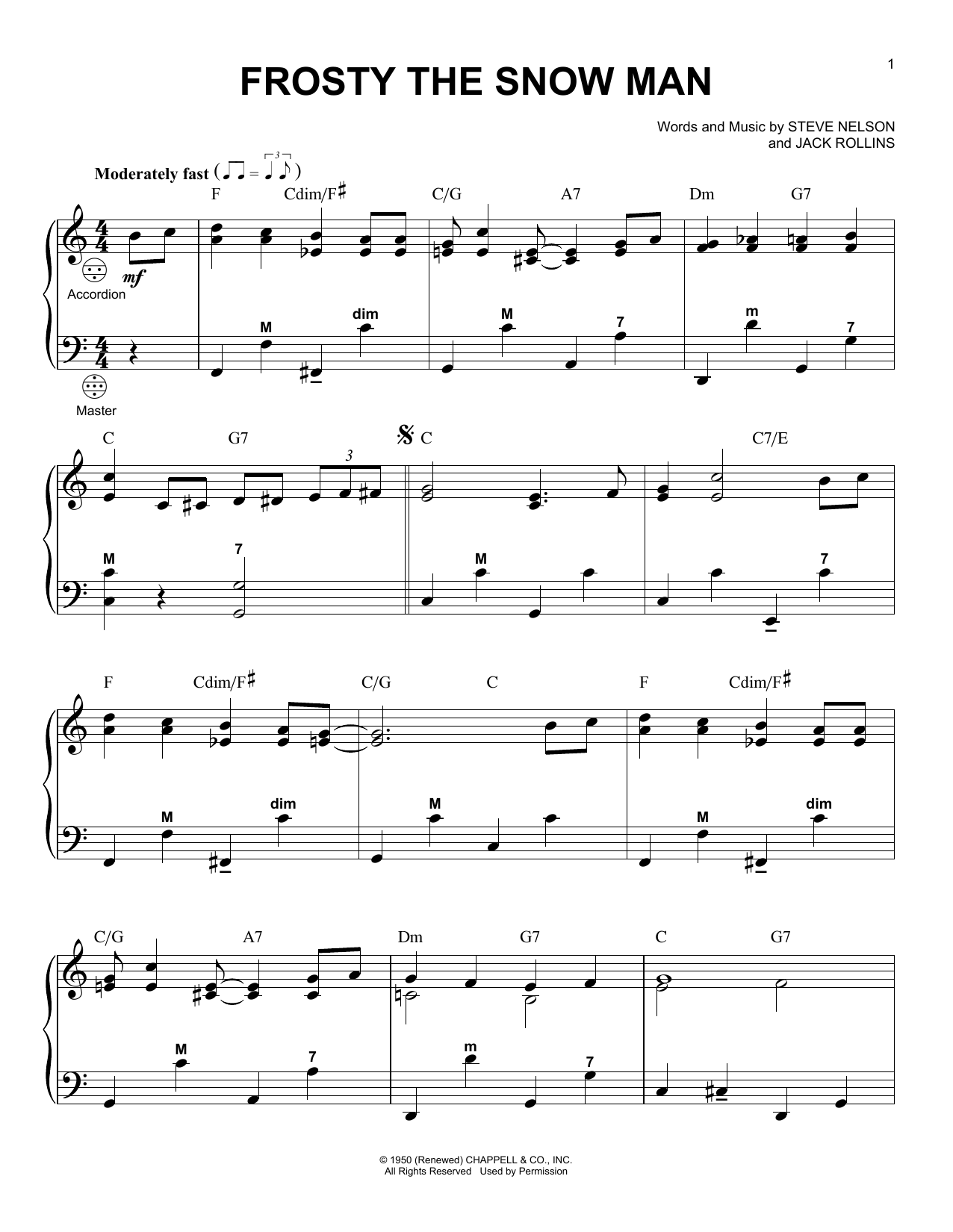 Download or print Steve Nelson Frosty The Snow Man sheet music, chords and digital score arranged for Lead Sheet / Fake Book. This Christmas score includes 1 page(s).