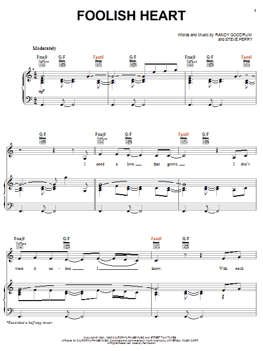 Download or print Steve Perry Foolish Heart sheet music, chords and digital score arranged for Lead Sheet / Fake Book. This Pop score includes 2 page(s).