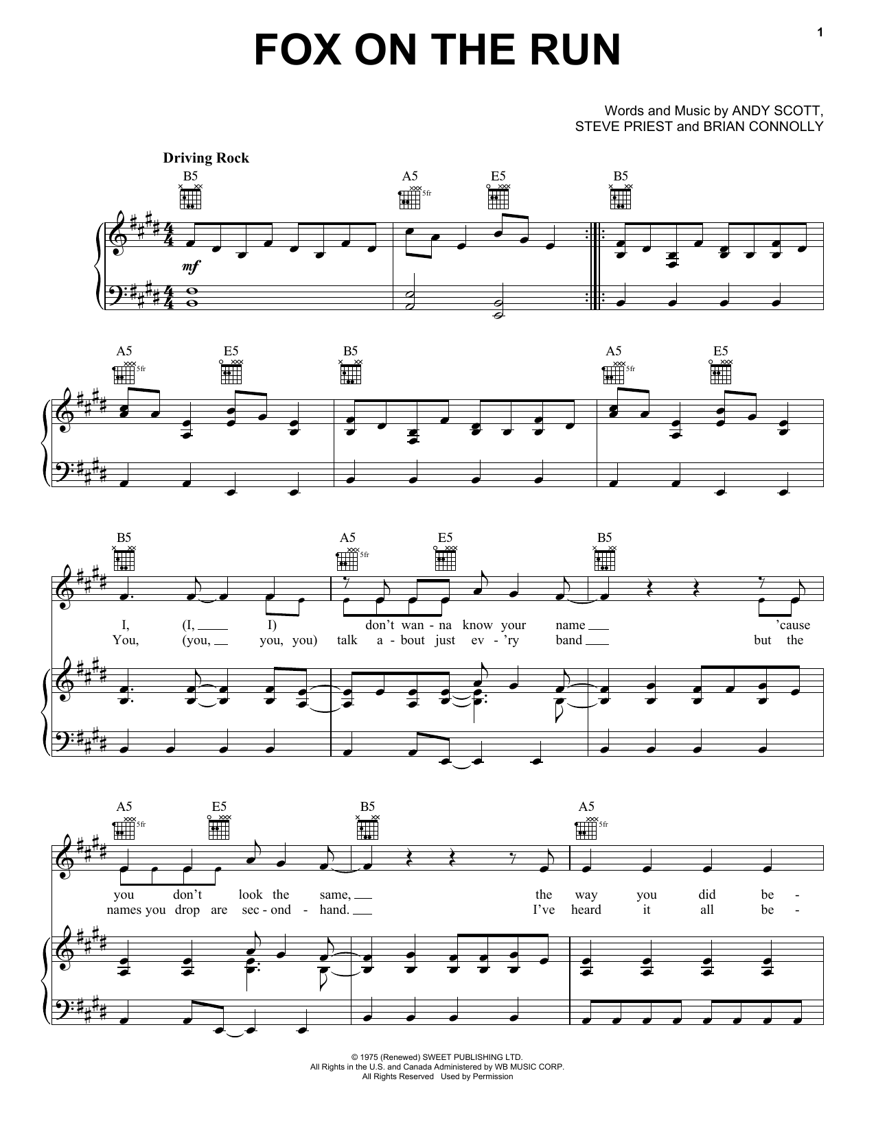 Download or print Steve Priest Fox On The Run sheet music, chords and digital score arranged for Piano, Vocal & Guitar Chords (Right-Hand Melody). This Pop score includes 4 page(s).