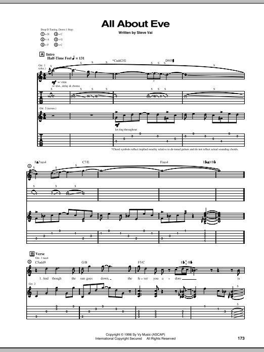 Download or print Steve Vai All About Eve sheet music, chords and digital score arranged for Guitar Tab. This Metal score includes 9 page(s).