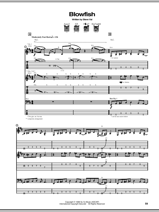 Download or print Steve Vai Blowfish sheet music, chords and digital score arranged for Guitar Tab. This Metal score includes 17 page(s).