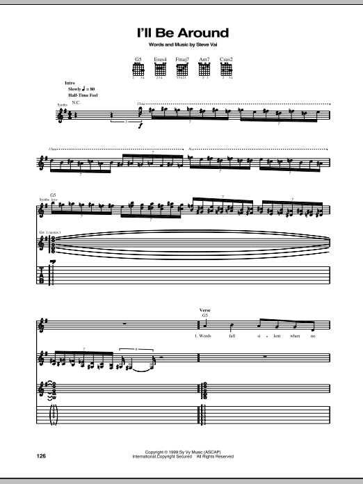 Download or print Steve Vai I'll Be Around sheet music, chords and digital score arranged for Guitar Tab. This Metal score includes 10 page(s).