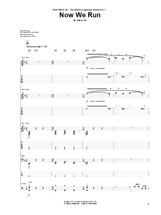Download or print Steve Vai Now We Run sheet music, chords and digital score arranged for Guitar Tab. This Metal score includes 6 page(s).