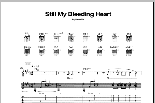 Download or print Steve Vai Still My Bleeding Heart sheet music, chords and digital score arranged for Guitar Tab. This Pop score includes 1 page(s).