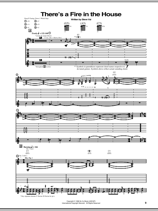 Download or print Steve Vai There's A Fire In The House sheet music, chords and digital score arranged for Guitar Tab. This Metal score includes 13 page(s).