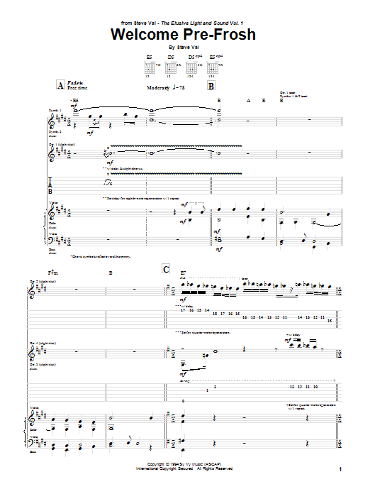 Download or print Steve Vai Welcome Pre-Frosh sheet music, chords and digital score arranged for Guitar Tab. This Metal score includes 3 page(s).