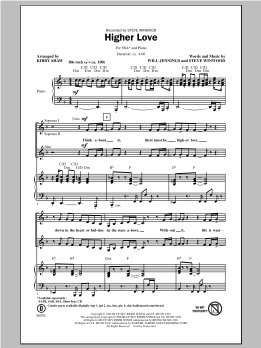 Download or print Kirby Shaw Higher Love sheet music, chords and digital score arranged for SAB Choir. This Pop score includes 11 page(s).